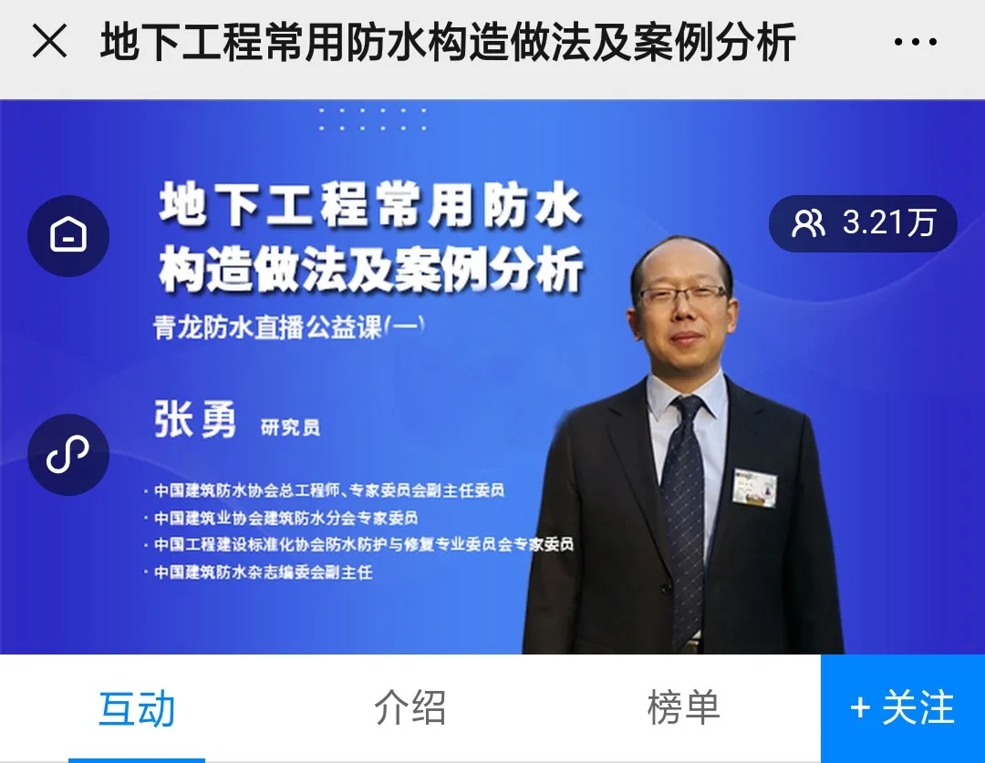 目前,防水公益大講堂已經直播了三位防水行業重量級的大咖:中國建筑防水協會副會長瞿培華、防水博士張勇、中國建筑防水協會專家委員會副主任委員朱志遠。直播粉絲平均3萬,場場精彩,讓人大受啟發,轟動了整個防水行業。