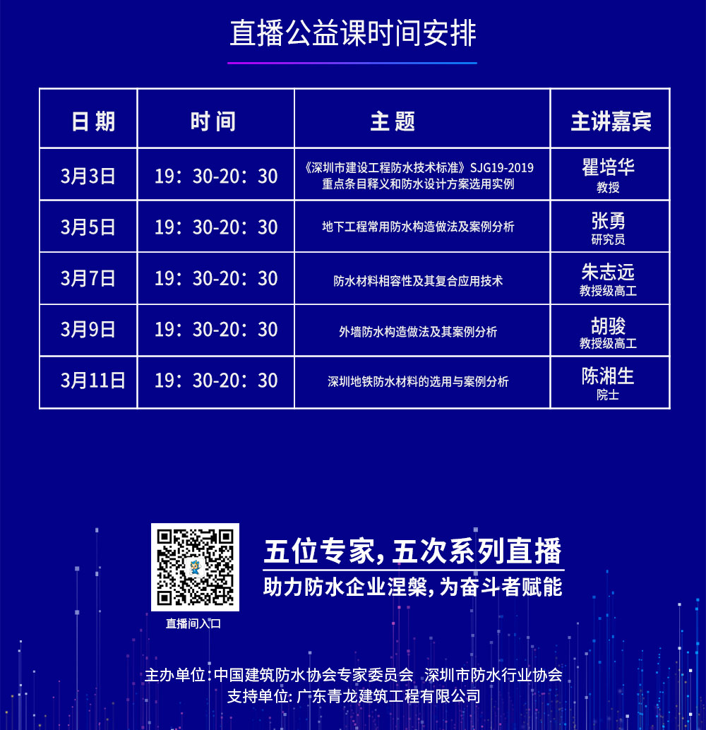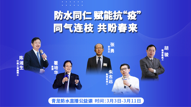 本次防水公益直播是為貫徹落實黨中央關于新冠肺炎疫情防控工作的決策部署,積極響應各級政府的號召,由中國建筑防水協會專家委員會、深圳市防水行業協會主辦,廣東青龍建筑工程有限公司協辦,直播由陳湘生院士領銜,瞿培華教授、張勇博士、朱志遠教授和胡駿教授4位專家支招,助力防水企業涅槃,為奮斗者賦能,讓我們防水人同氣連枝,共盼春來。