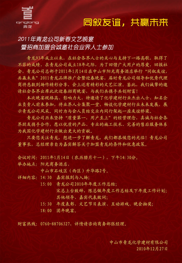 2011年青龍公司新春文藝晚宴暨招商加盟會誠邀社會業界人士參加