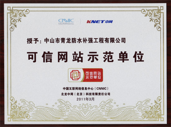2010年10月29日,中國省級"可信網站示范工程"試點已在廣東啟動,首批"可信網站示范單位"也同期評出。國內建筑防水、保溫、加固、GRC裝飾材料集大成者,國內較大的EVB保溫砂漿生產商,高新技術企業——青龍化建(