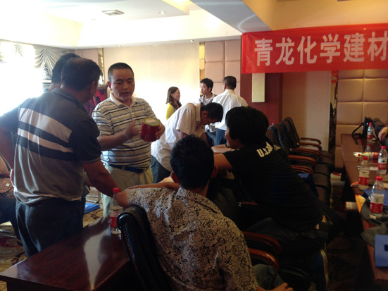 會議結束后,針對大家提出的“怎樣的材料是綠色環保的”,“怎樣的施工工藝是綠色環保的”,“綠色施工在PCM反應粘新品上有什么樣的體現”等問題,徐總一一做出詳細的解答,并與大家做了詳細交流。青龍公司向與會人員贈送CQ101水固化聚氨酯防水涂料,并對照GRC樣品進行詳細解說,交流會現場確定了涼山州五縣代理商。
