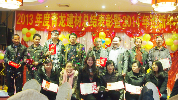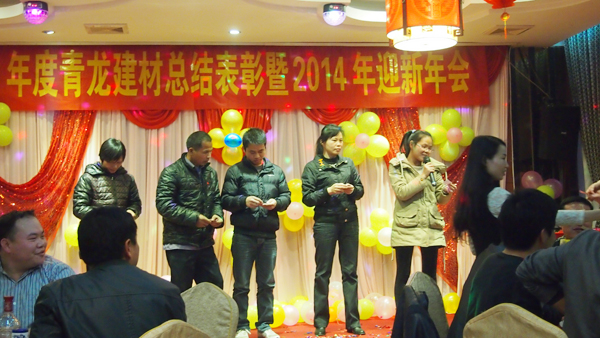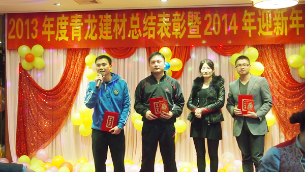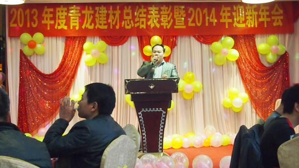 晚宴上,青龍廣西分公司韋流武先生代表集團董事長宋總致晚宴開幕辭并送上新年祝福。韋經理總結了2013年青龍廣西化學建材的發展歷程,肯定了2013年所取得的成績,并對2014年寄予了美好展望。之后對2013年青龍廣西化學建材表現優異的員工進行表彰,鼓勵大家向他們學習,繼續為生產中國較好的防水材料而奮斗。
