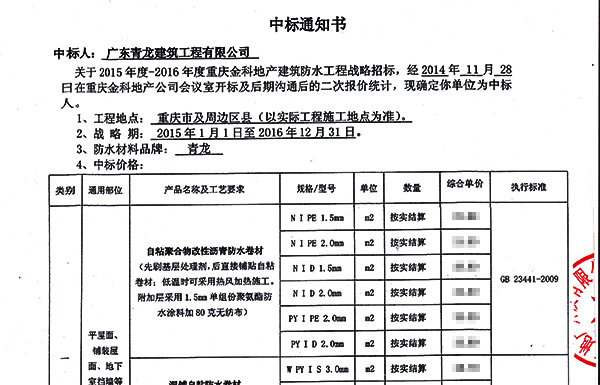 青龍集團(tuán)中標(biāo)金科地產(chǎn)防水工程戰(zhàn)略招標(biāo)