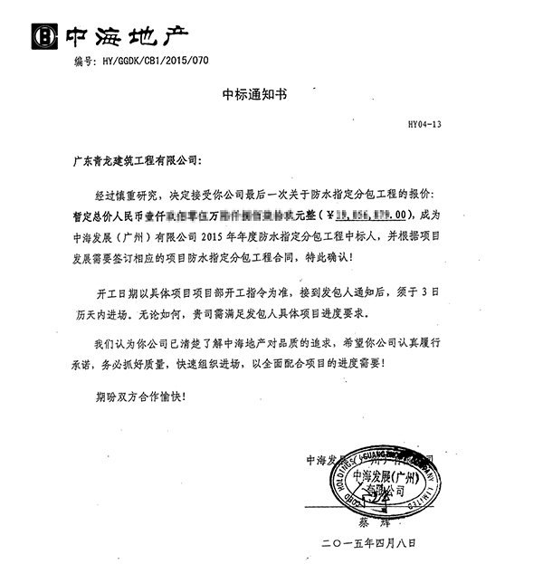 青龍集團(tuán)中標(biāo)中海地產(chǎn)廣州防水項目通知書