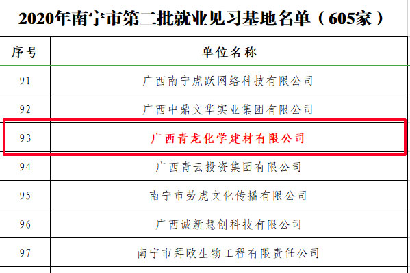 近日,從南寧市人力資源和社會保障局獲悉,為扎實推進(jìn)高校畢業(yè)生就業(yè)見習(xí)工作,經(jīng)南寧市人力資源和社會保障局審核通過,我司廣西青龍化學(xué)建材有限公司被認(rèn)為2020年~2022年南寧市就業(yè)見習(xí)基地。