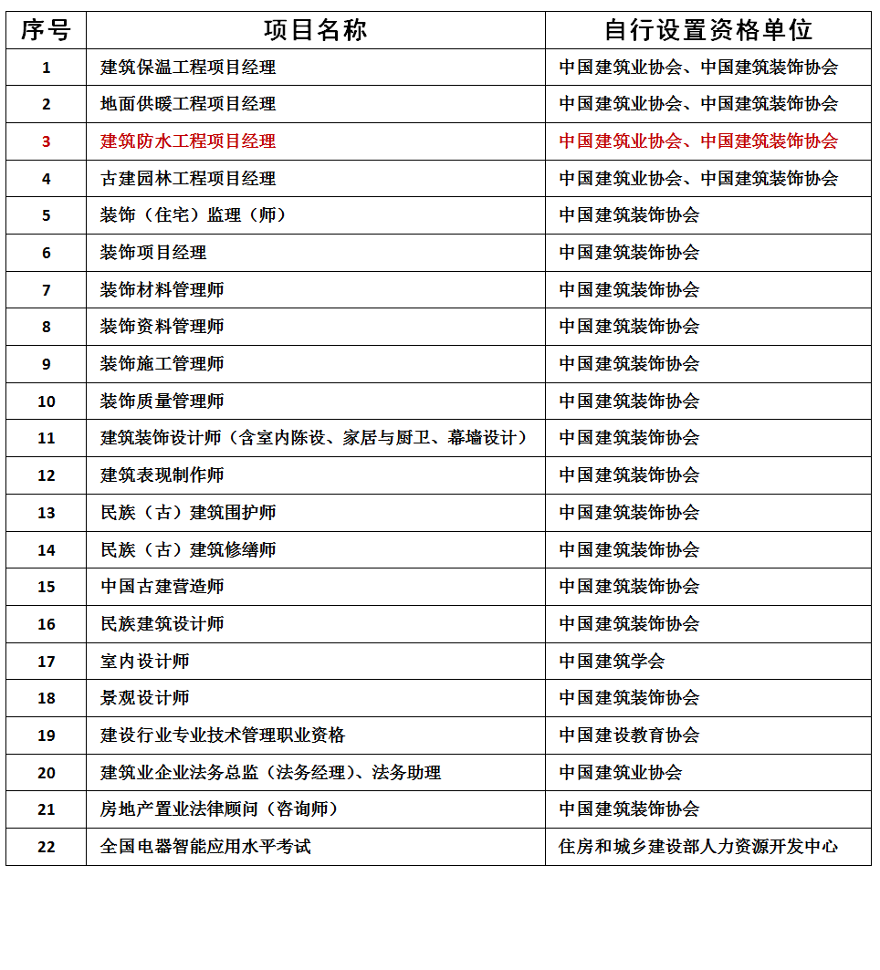 建筑防水工程項目經理等22項職業資格的評價、認定、發證等工作被叫停,這是住房城鄉建設部辦公廳近日下發的通知明確的。
