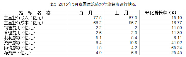 5月,防水企業主營業務收入為77.5億元,環比增長15.10%。利潤總額為5.1億元,環比下降6.11%。